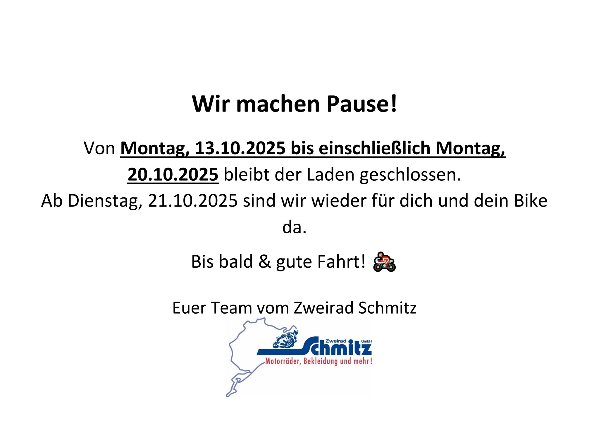 Ab Dienstag, 21.10.2025 sind wir wieder für dich und dein Bike da.